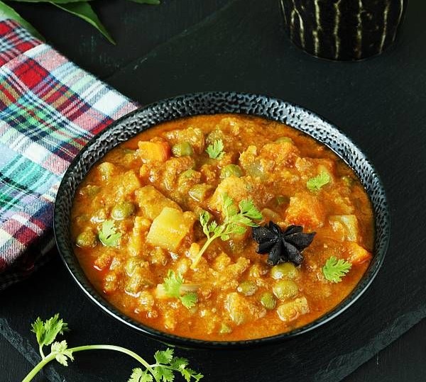 This super aromatic and delicious vegetable korma is made with potatoes, peas, carrots, French beans, onions, tomatoes, coconut or yogurt, nuts and spices.